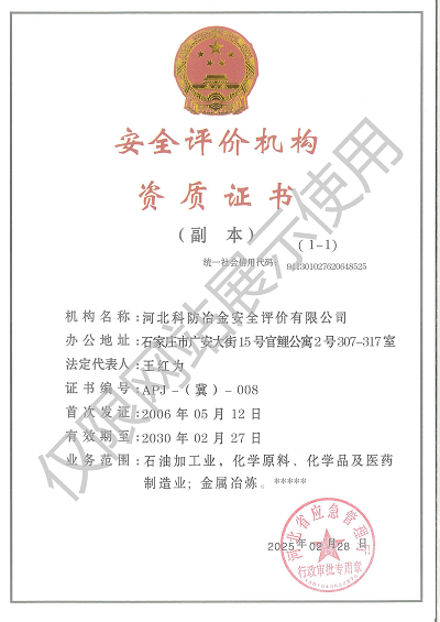河北科防冶金安全評價有限公司成立于2004年5月,注冊資本2000萬元,是專業從事安全評價、安全生產標準化咨詢、安全生產標準評審、職業病危害因素檢測和評價、安全生產隱患排查、應急管理咨詢及預案編制等安全生產綜合技術服務公司。現有專家、專業技術人員110人,專業覆蓋安全、化工工藝、化工機械、自動化、電氣、機械、冶金、有色金屬等。